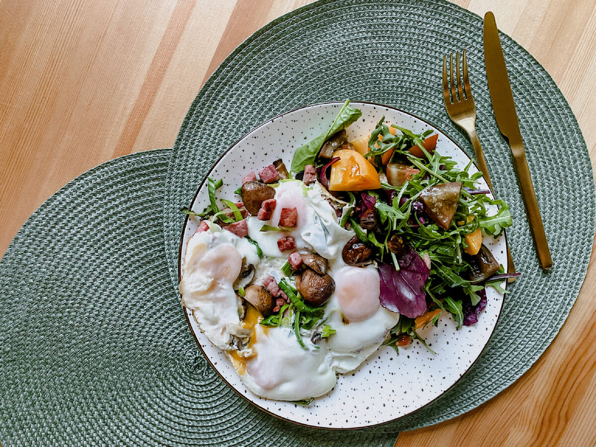 Глазунья с «Королевскими» шампиньонами и салатом. Первый прием пищи за день на скорую руку из простых продуктов, что может быть лучше. Утром я отдаю предпочтение овсяной каше с фруктами, ягодами или орехами. А можно все и сразу, главное в меру))) Заставить меня есть что-то другое практические невозможно, но можно. Сегоня именно тот день. Давайте готовить. НАМ ПОНАДОБИТСЯ: яйцо куриное 4 шт «Королевские» шампиньоны 4 шт лук порей 50-70 говядина 100 гр оливкой масло соль, перец по вкусу ДЛЯ САЛАТА ПОНАДОБИТСЯ: миск салат 100-150 гр томат желтый 1 шт томат черный 1 шт оливкой масло соль, перец по вкусу Подготавливаем овощи. Промываем салат и даем ему немного обсохнуть. Разрезаем томаты пополам, убираем жопку. Нарезаем помидоры крупно, обычно режу их пополам и далее на 4/6 части и отправляем к салату. Заправляем оливковым маслом и солим по вкусу. Лук порей нарезаем тонко кольцами или полукольцами. Шампиньоны нарезаем крупно на 4 части. Мясо может быть любым, подойдут да