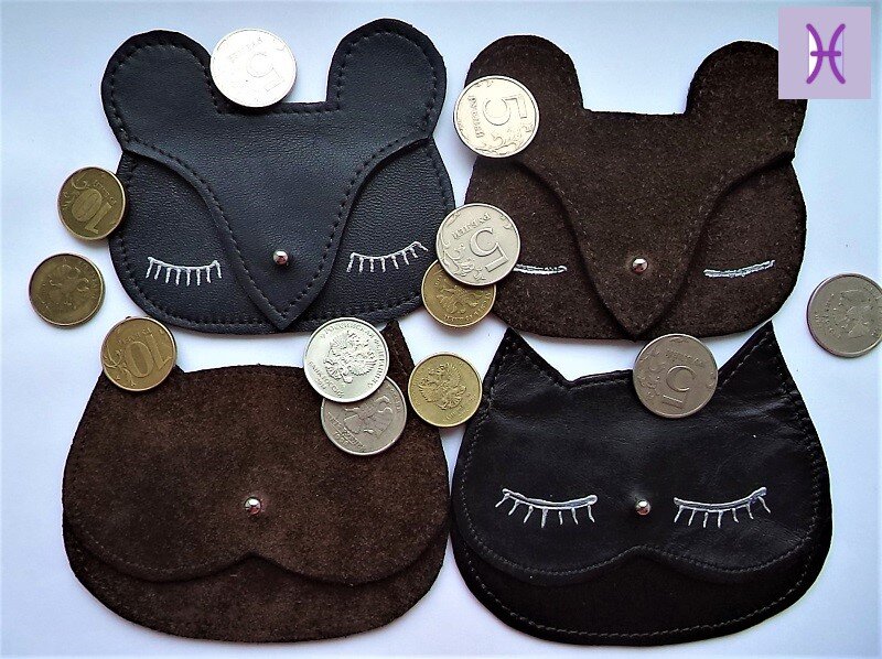 Предлагаю пару идей для кошельков-монетниц. Идеи не мои. Я просто видела такие кошельки. И сшила похожие. Эти кошельки, что представлены в публикации, сшиты мной и выкройки для них также сделаны мною. Я шила кошелечки из натуральной кожи и натуральной замши. Шила параллельно двух котиков и двух мышек. Чтобы сшить такие кошельки, кроме кожи и замши, ещё нужен клей и кобурные винты. Клей, для работы с кожей, я использую Момент Кристалл. А кобурные винты, вот они на фото. У данной фурнитуры много названий, в том числе и кобурная кнопка, и застежка кобурная, и кнопка сумочная. Кошелек-монетница №1. МЫШКА. Размер кошелька 11 см х 9 см. Я уже как-то рассказывала, что я покупаю обрезки кожи в одном городском ателье. Больших кусков там, конечно, нет, но такие, чтобы можно было выкроить детали для небольшого кошелечка, подобрать можно. Подобрала по размерам кусочки кожи для каждого шаблона. В ателье кожа в основном одежная, а она немного тонковата для сумок, кошельков. И её обязательно нужно уп