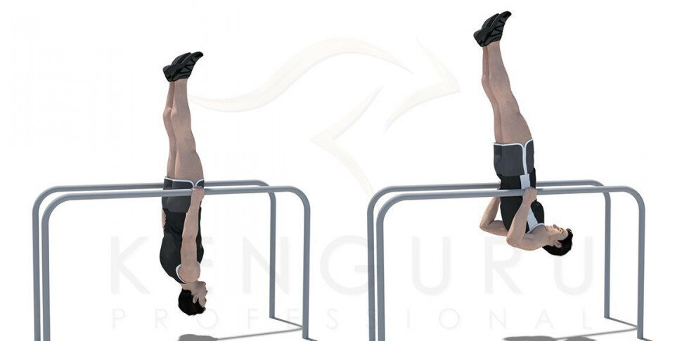 Примите исходную позицию на снаряде на выпрямленных руках. В верхнем положении старайтесь не наклоняться, ноги держите скрещенными или просто соедините их между собой.