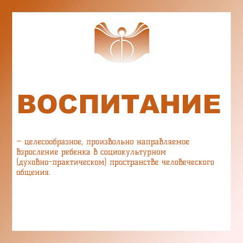 ВОСПИТАНИЕ – целесообразное, произвольно направляемое взросление ребенка в социокультурном (духовно-практическом) пространстве человеческого общения. В более широком смысле воспитание понимается как любое сознательно планируемое интеллектуальное, эстетическое и нравственное влияние на индивида или группу людей любого возраста.