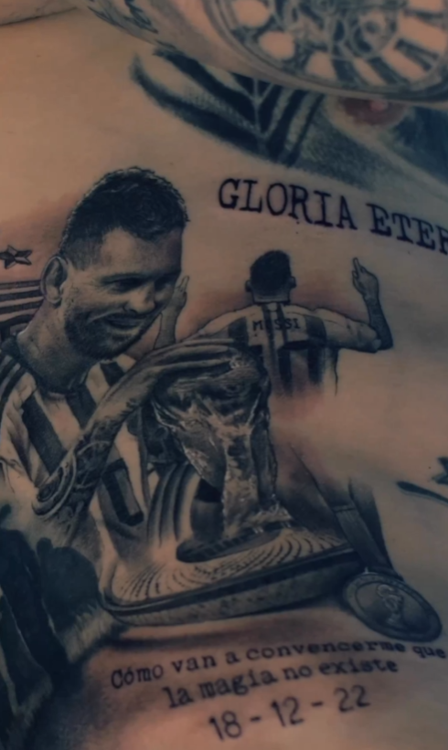 Николас Отаменди сделал тату с Лионелем Месси в честь победы Аргентины на ЧМ-2022. Защитник сборной Аргентины и «Бенфики» показал тату на правой стороне живота, где изображен игрок «ПСЖ», касающийся Кубка мира, а также стоящий спиной и воздевающий руки к небу. Под изображениями Месси есть надпись «Как мне докажут, что магии не существует?», а также дата финального матча с Францией. Месси выложил тату в своем инстаграме и написал: «Я видел много впечатляющих вещей, касающихся меня и чемпионата мира, но то, что такой коллега, друг, как Николас Отаменди, сделал эту татуировку – это нечто большее, чем нечто особенное». «Вещи, которые ты видел, – ничто по сравнению с тем, что мы видим, играя вместе с тобой. Ты не только вся страна, ты история футбола. Люблю тебя, мой друг», – ответил Отаменди. Фото: инстаграм Николаса Отаменди