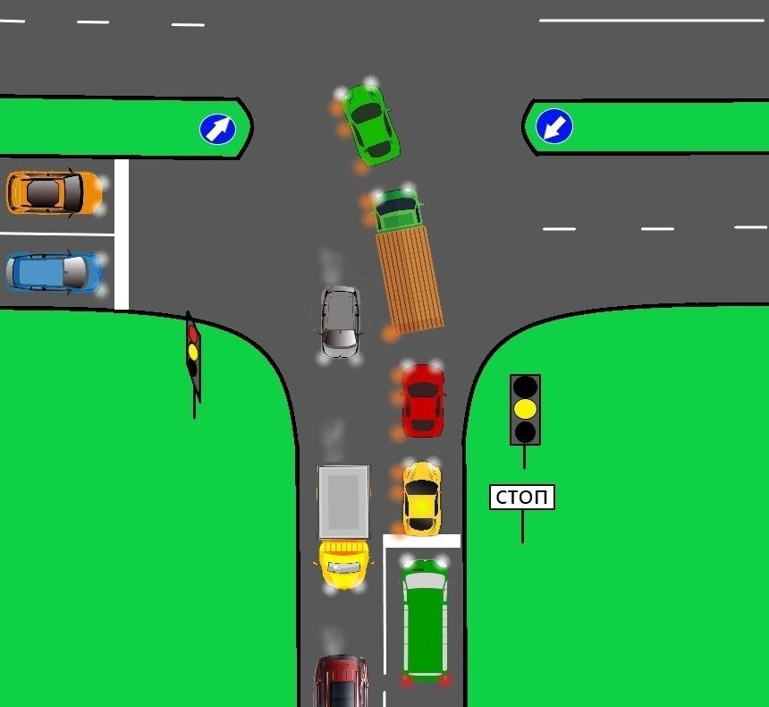 Чтобы разобраться, попробуем сначала немного "отмотать" ситуацию назад. Итак, представим: все 4 автомобиля, которые собираются повернуть налево и про которые спрашивается в задаче, сначала стояли на запрещающий сигнал светофора перед стоп-линией в соответствии с пунктом 6.13 ПДД. При этом обратим внимание на расположение стоп-линии: она находится не в пределах перекрёстка и не на его границе, а на определённом расстоянии перед границей перекрёстка. После того, как для этих автомобилей включился разрешающий сигнал светофора, они начали движение для выполнения манёвра и расположились на тех позициях, которые обозначены на рисунке, чтобы согласно пункту 13.4 ПДД уступить дорогу тем, кто движется со встречного направления прямо или направо. Пока они, уступая дорогу по пункту 13.4 ПДД, ожидали возможность завершить манёвр, зелёный светофор замигал и сменился жёлтым.