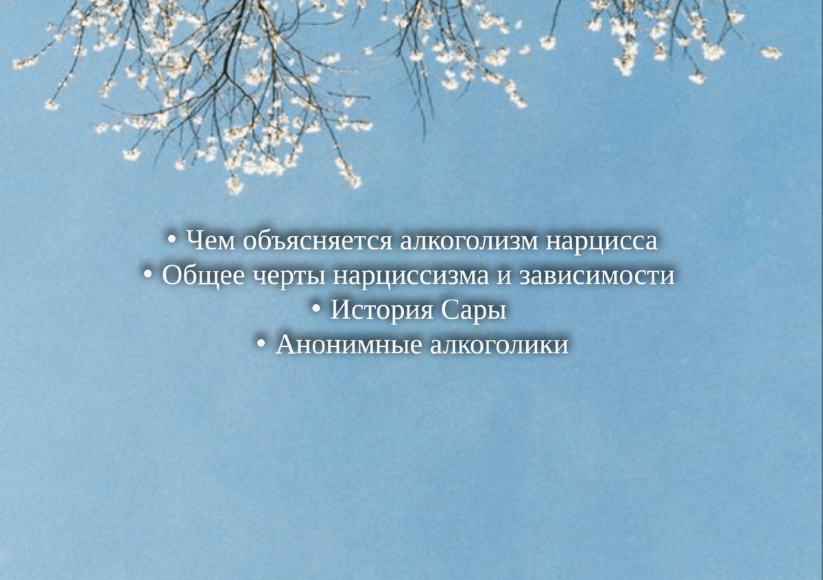 Нарцисс в периоды, когда его грандиозность сменяется самобичеванием, не может столкнуться с настоящим собой и своими чувствами и предпочитает включить защитные механизмы отрицания и избегания. Проще говоря, он заливает свою пустоту и внутреннюю тьму.