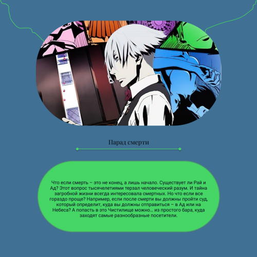 По существу, буду писать о том или ином, когда мысли более менее свежие. Вчера мы досмотрели аниме под названием "Парад смерти". Необычное аниме, ранее таких не встречали, и за последнее время, наверное, единственное что заставило задуматься. Например, я резко впала в пучину дум о смерти, и как скоро это произойдет и вообще сколько мне осталось...