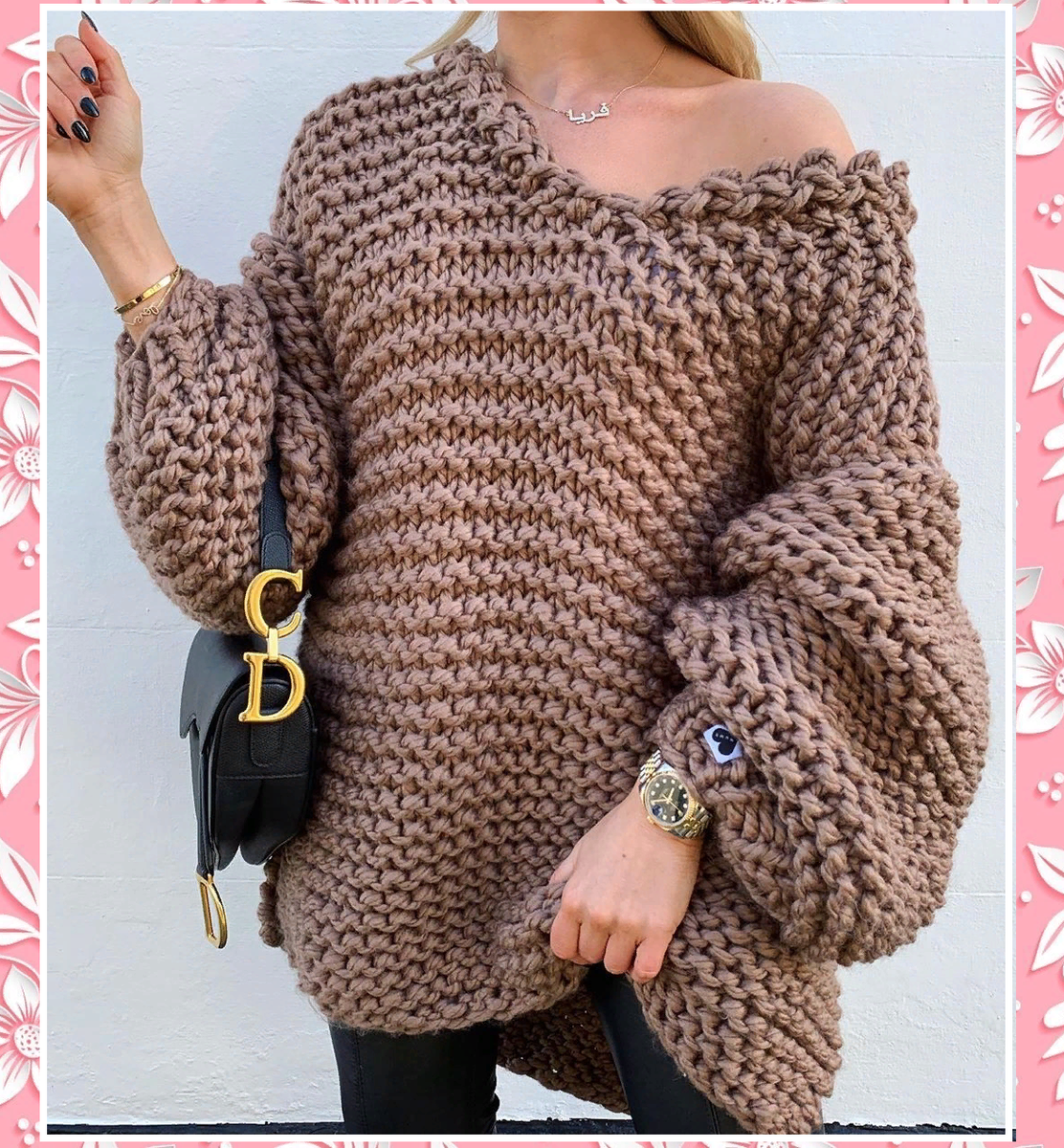 Изделия свободного фасона из крупной пряжи на пике популярности. И это здорово, ведь на вязание, к примеру, пуловера для опытной вязальщицы уйдет буквально один день. Да и начинающим мастерицам потребуется не более пары-тройки дней/вечеров. Сегодня вашему внимаю предлагаю такой вариант: Пряжу подберите на свой вкус. Толщина нити должна быть в пределах 25-50 м на 100 г. Спицы №10-15 (смотрите рекомендации производителя пряжи на упаковке). На изделие размера 36-38 уйдет примерно 9-10 мотков. Модель очень простого кроя – никаких пройм, скосов, сложных узоров... Основа (перед и спинка) состоит из 2-х прямоугольников, связанных платочной вязкой. Передняя часть имеет неглубокий V-образный вырез без бейки. Рукава также можно вязать прямоугольниками без убавок/прибавок на плечи. Резинка – около 7-8 см. Для неё следует использовать спицы меньшего размера. В целом, для удобства, рукава можно вязать круговыми спицами, чтоб потом меньше сшивать. В общем, подобная модель свитера вяжется достаточ