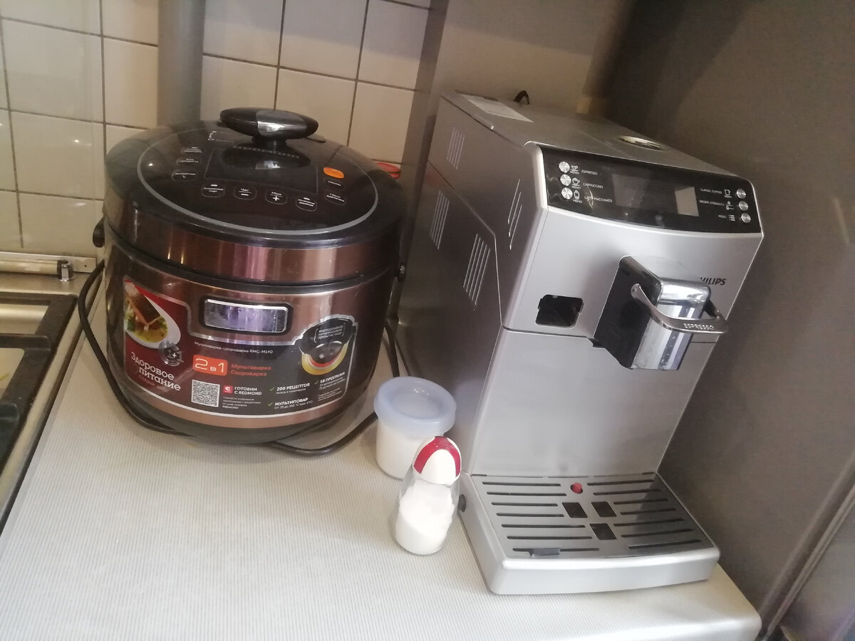 Сейчас создано очень много помощников для кухни. Электронные приборы сами замешивают тесто, пекут хлеб, варят суп и делают многое другое. Реклама внушает, что с ними наша жизнь заиграет всеми цветами радуги. Но бывает, что через месяц после покупки мы чувствуем, что наигрались и предмет зря занимает драгоценное место на кухне. Составила небольшую подборку из кухонных приборов с категориями "то, чем пользуюсь не менее 1-2 раз в неделю более 5 лет", "то, чем не пользуюсь" и "при возможности обязательно приобрету". О таких приборах, как плита и холодильник даже не пишу, без этого не представляю себе ни одну кухню. Итак, 7 любимых кухонных помощников: - 1. Кофемашина. Мы прошли пусть с низов, с растворимого кофе. Потом перешли к турке и молотому кофе. Далее к союзу кофемолки и капельной кофеварки. Конечно, кофемашина занимает много места, но для неё его совершенно не жалко. 2. Мультиварка-скороварка. Это уже вторая моя мультя. До этого была самая простая от редмонд, которая покорила м