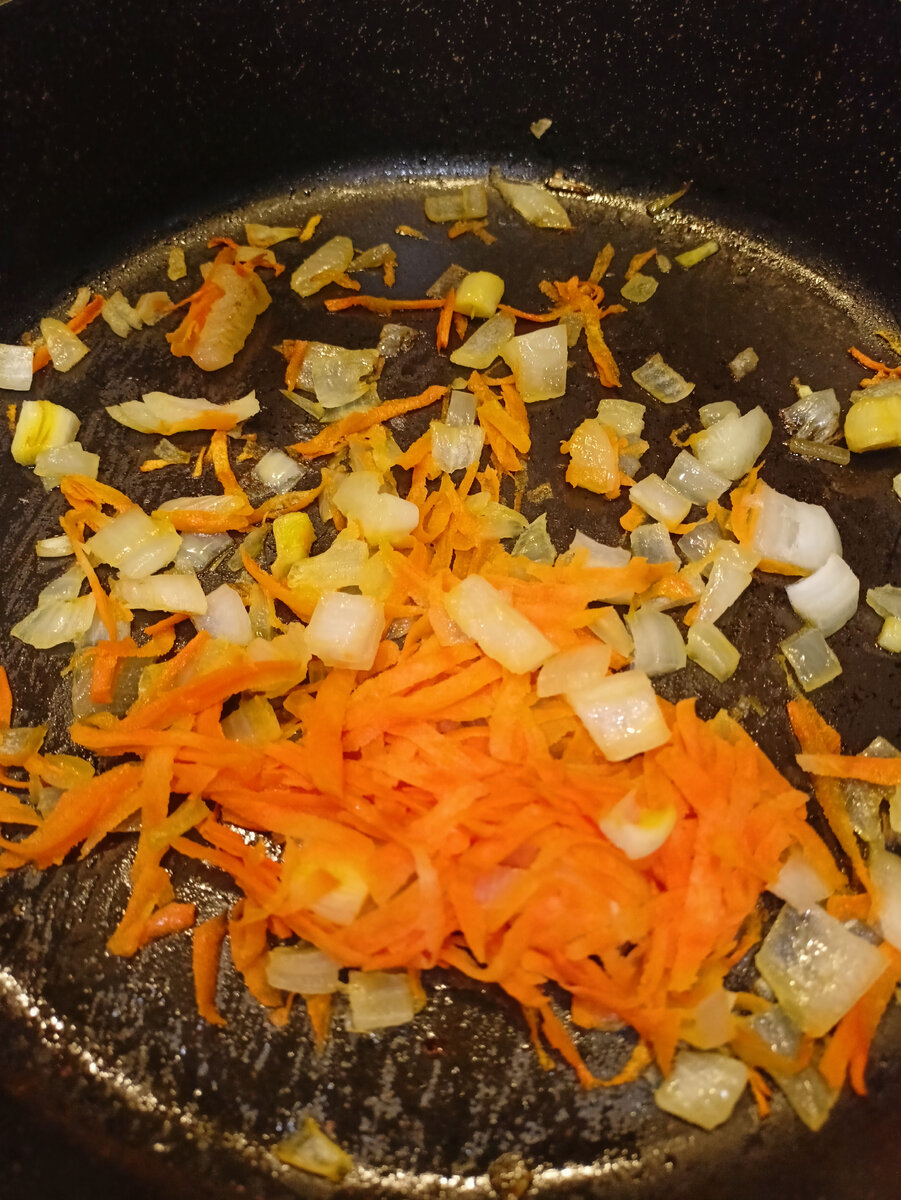 Морковь натираю на крупной терке и отправляю к луку
