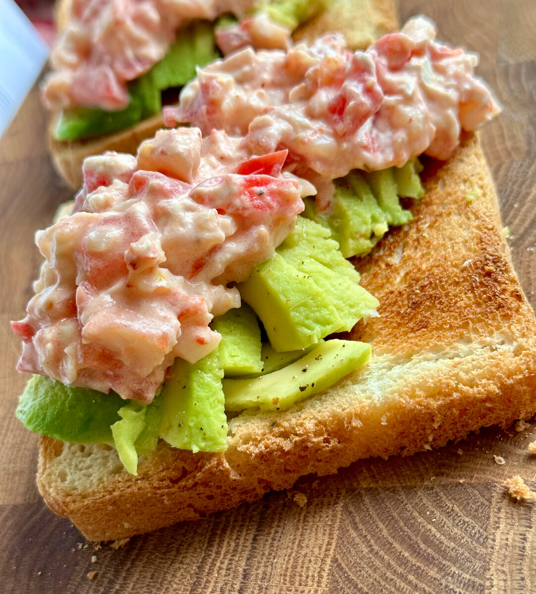 Если у тебя мой голодный читатель, так же как и у меня, оказалась в морозилке маленькая кучка креветок предлагаю приготовить такие тосты. Что понадобится: Поехали готовить: Берём любой хлеб и жарим его до хрустящей корочки. Я использую для этого тостер. Ставим небольшую кастрюлю на огонь. Замороженные креветки промываем под холодной водой, чтоб убрать лёд. Моем томат и авокадо. В кипящую воду кидаем лавровый лист, перец, соль и мороженные креветки. Поварить их в кипящей воде минуты три. Сваренные креветки откидываем на дуршлаг. Как немного остынут их надо почистить. Пока порежем помидор мелкими кубиками, к нему порезали очищенные креветки, добавляем творожный сыр, немного соли и перца и перемешиваем. Авокадо - его разрезаем пополам, вынимаем косточку и режем тонкими слайсами. Собираем наш тост - на хрустящий хлебушек выкладываем авокадо, его я тоже немного присыпала солью и молотым чёрным перцем. Поверх авокадо идут помидоры с креветками. Иии… и осталось налить кружку ароматного