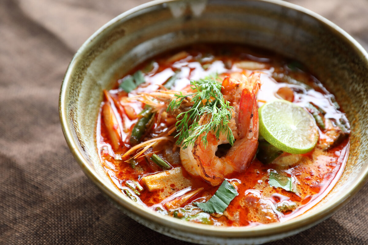5 апреля во всем мире отмечают Международный день супа. Предполагается, что первыми жидкое блюдо сварили синантропы, которые триста тысяч лет назад научились пользоваться огнем для готовки. В наши дни суп считается важной частью ежедневного рациона, а технологии его приготовления существовали еще за 100 лет до нашей эры в Древнем Китае. Суп в более привычном нам понимании появился в Европе в XV—XVI веках. Один из самых популярных супов современности — том ям. Он появился несколько столетий назад в Таиланде и Лаосе, и с тех пор претерпел много изменений. Например, блюдо ставили готовить на кокосовом молоке и добавлять в него креветки. 📌Подписывайтесь на наш канал, чтобы сохранить все рецепты в одном месте! ☝️Чтобы приготовить том ям дома вам понадобится: Оттаявшие креветки очистите от панциря, голов и хвостов, уберите полые вены на спинке. Отделите шляпки грибов от ножек и крупно нарежьте (ножки не понадобятся). Лемонграсс разрежьте пополам, а имбирь или галангал — тонкими пластинами.
