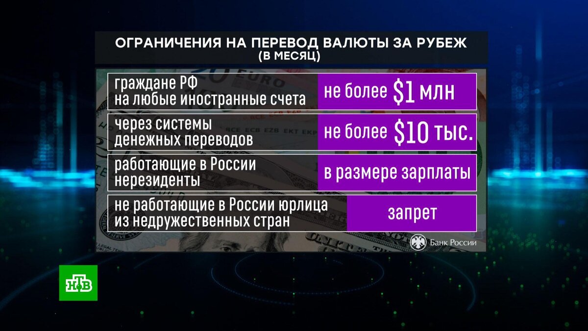 [ Смотреть видео на сайте НТВ ] До 30 сентября Центробанк продлевает ограничения на денежные переводы за границу. Центробанк России объявил, что продлевает ограничения на перевод денег за рубеж на полгода, до 30 сентября. Граждане России смогут за месяц перевести на любые счета в зарубежных банках до 1 миллиона долларов, а вот по системам денежных переводов — не более 10 тысяч. Физическим лицам — нерезидентам, в том числе из недружественных стран, работающим в нашей стране, разрешено переводить за рубеж средства, не превышающие их зарплаты. А запрет на перевод средств за рубеж для физлиц-нерезидентов из недружественных стран, не работающих в России, сохраняется. Исключение составляют иностранных компании, которыми руководят или владеют россияне. [ Смотреть видео на сайте НТВ ]