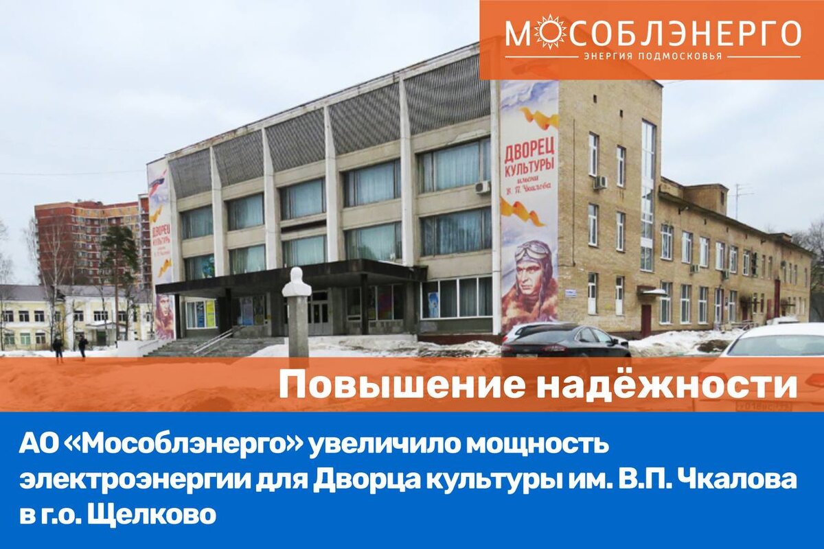 АО «Мособлэнерго» увеличило мощность электроэнергии для Дворца культуры им. В.П. Чкалова в г.о. Щелково. В текущем году в ДК завершился капитальный ремонт и для обеспечения его возросшего энергопотребления сотрудники Щелковского производственного отделения установили два более мощных трансформатора 630 кВА, а также проложили четыре кабельные линии 0,4 кВ общей протяженностью 500 метров. Работы проводились в рамках договора технологического присоединения учреждения культуры к сетям компании. Во Дворце культуры имени В.П. Чкалова действуют 35 кружков творческой направленности, в них занимаются более 750 детей и взрослых. В ходе капремонта здесь были отремонтированы малый и хореографический залы, кабинет изобразительного искусства, библиотека, обновлены инженерные системы и вспомогательные помещения, установлены системы вентиляции, дымоудаления и слаботочная система. АО «Мособлэнерго» уделяет особое внимание подключению социально значимых объектов к сетям компании, а также увеличению для