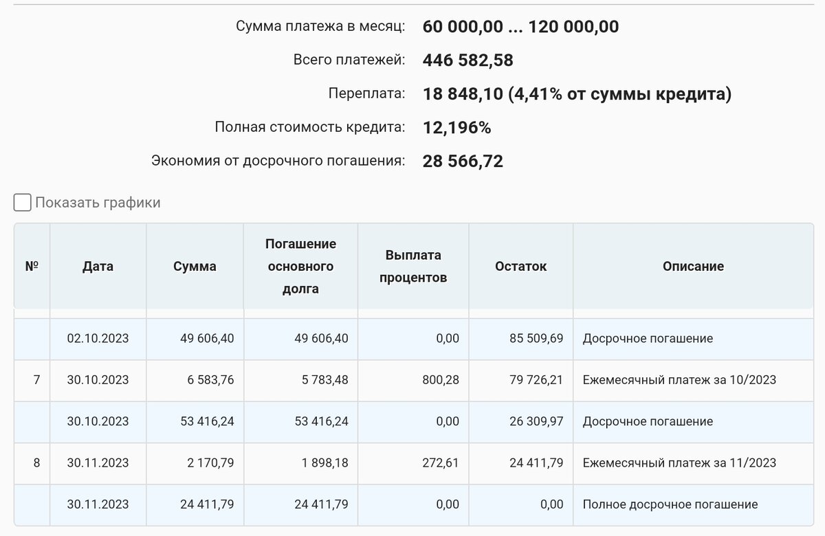 Но я не хочу расслабляться. Дай бог, чтоб все шло как я хотела - платежи по 60 тыс. в месяц, и тогда мой кредит будет выплачен в ноябре 2023 года!
