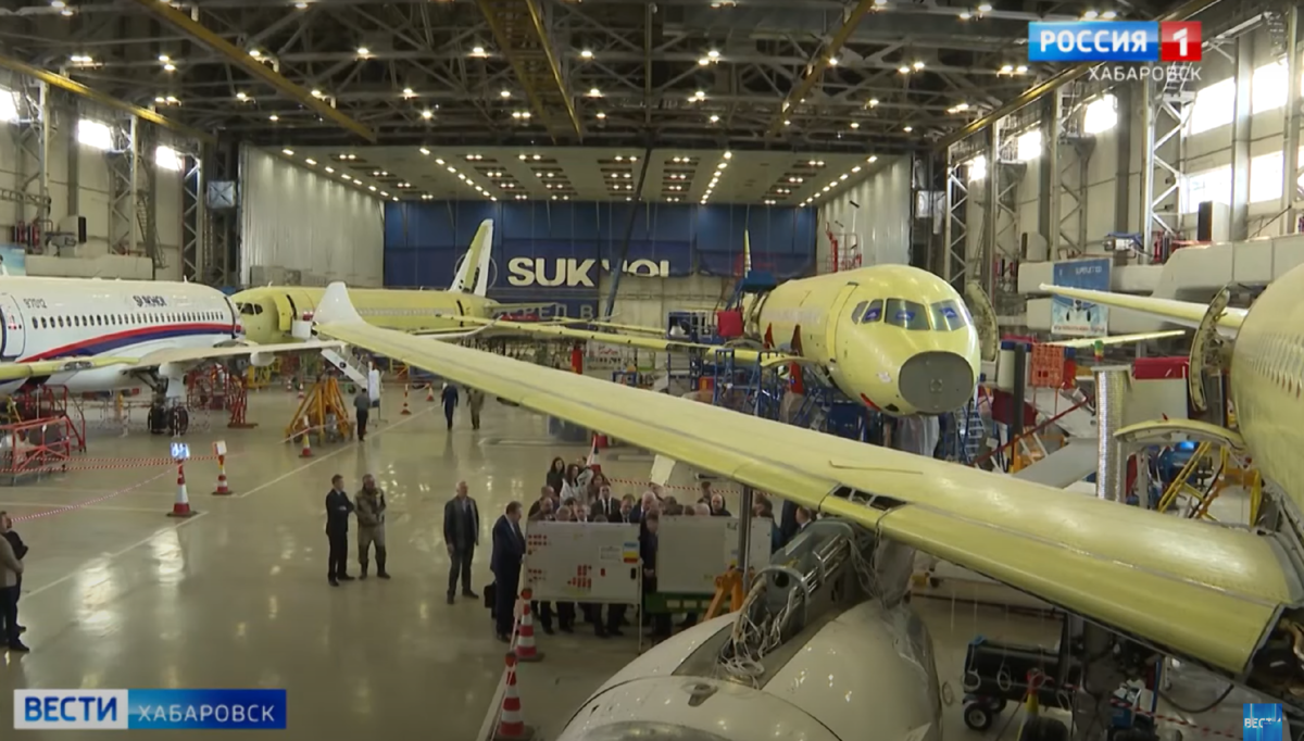 Вести Хабаровск опубликовали видео из цеха окончательной сборки КнААЗ, где видны сразу три новейших полностью отечественных лайнера SSJ-New в высокой степени готовности.