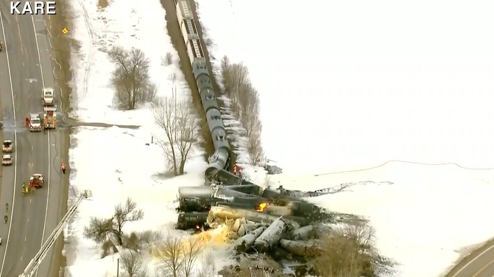 Министерство транспорта Миннесоты закрыло близлежащее шоссе из-за схода с рельсов и пожара, сообщили в пожарной службе.