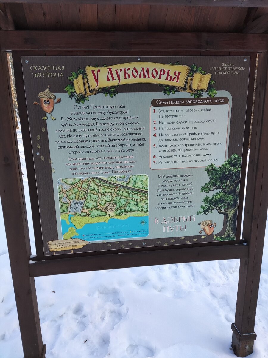 Здравствуйте дорогие подписчики! Сегодня я хочу рассказать о необычной локации, которую открыли в 2021 году в поселке Лисий нос. Находится эта сказочная экотропа на территории заказника "Северное побережье Невской губы", а преимуществом является небольшая удаленность от города в сочетании с прекрасными видами и информационными табличками, которые будут интересны людям любого возраста. Начинается дорога от шоссе и проходит через лес, который выглядит загадочно и можно поверить в сказки. Этот парк был создан еще во времена Петра I и называется "Ближние дубки". На маршруте есть очень старый дуб и если верить информационной табличке, то ему 320 лет и он современник Петра I. Это дерево внесли в реестр старовозрастных деревьев России. На маршруте 15 красочных стендов, на которых описание различных сказочных персонажей и загадки для детей. Оформление стендов содержит авторские рисунки и элементы, которые передают народный стиль. Есть также сказочный камень, который указывает направления ма