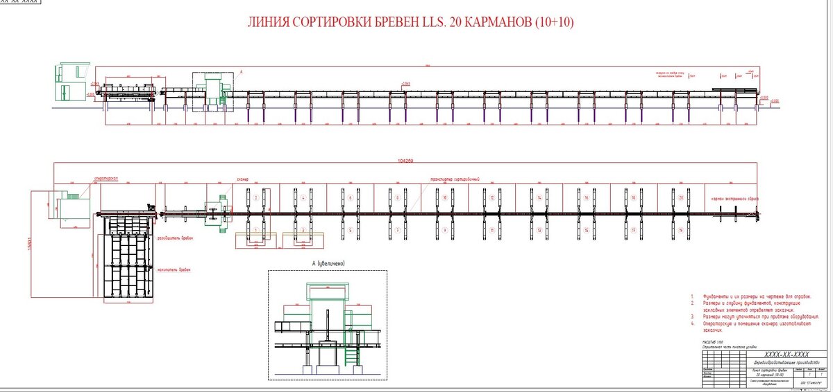 При этом линия сортировки круглого леса может занимать достаточно большие площади, и это нужно всегда иметь ввиду при проектировании завода. Например, линия сортировки на 20 карманов (двухсторонняя 10+10), для 6-ти метровых бревен, в длину занимает ~ 105 метров.