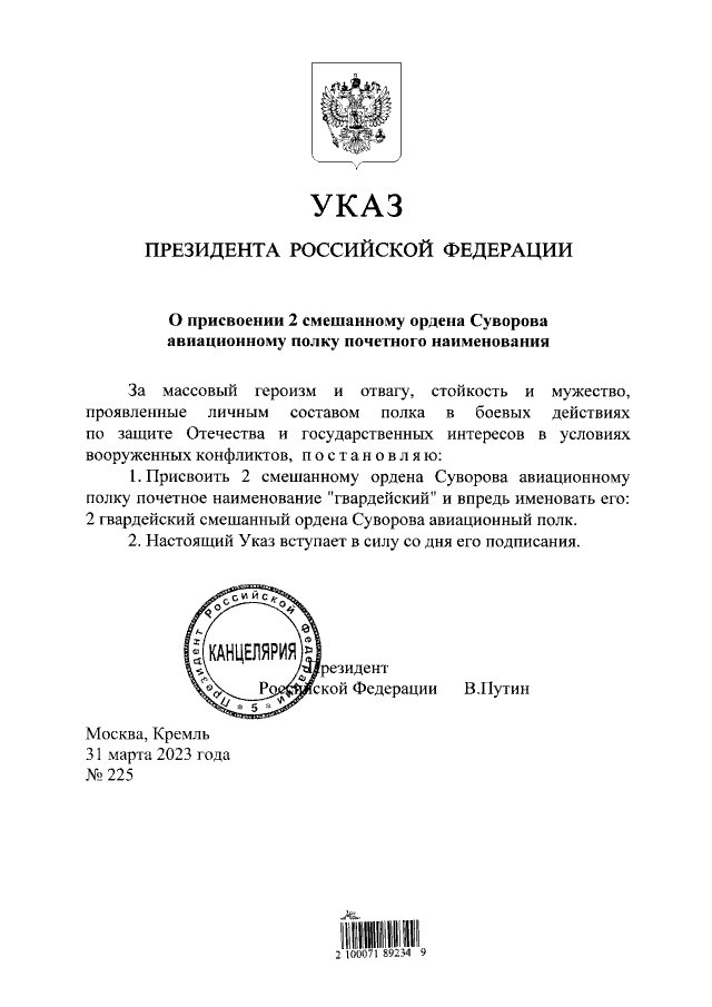 Президент Российской Федерации Владимир Путин подписал Указ о присвоении 236 артиллерийской бригаде почетного наименования «гвардейская». 2 смешанному ордена Суворова авиационному полку также присвоено почетное наименование «гвардейский».