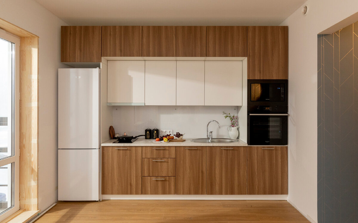 Не важно, планируем ли мы кухню для одиночки или для большой семьи, она всё равно будет похожа на оживлённую улицу. Кухня = движение. Это формирует запрос на широкую зону для прохода. Так не только удобнее, но и гигиеничнее, ведь в узких проходах люди чаще задевают фасады гарнитура. Добавьте ещё к этому, что в напольных модулях есть распашные дверцы и выдвижные ящики. Поэтому перед ними должно быть достаточно места для полного открывания и запас для того, чтобы человек мог беспрепятственно присесть или наклониться над шкафчиком.
