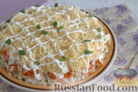 Измельчаем с помощью вилки рыбу и выкладываем на тарелку. Делаем сетку из майонеза. Измельчаем вареные яйца и выкладываем их на блюдо. Снова делаем сетку из майонеза. Следующий слой салата из яиц и консервированной рыбы – вареная морковь. Трем ее и распределяем равномерно. Покрываем сеткой майонеза. На слой моркови выкладываем измельченное яблоко. Последний слой – твердый сыр. Трем его и посыпаем салат. Делаем сеточку из майонеза и оставляем слоеный салат "Нежность" на два часа. За это время салат с сыром, яблоком, морко