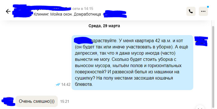 UPD: Спасибо всем за добрые слова и за совет обратиться на профи.ру. Сегодня у меня дома уже чисто. Пост нытья, если честно. Пытаюсь выкарабкаться из очередного затяжного приступа депрессии. Кто не знает, часто депрессия сопровождается неспособностью поддерживать порядок в доме. И сделать над собой усилие, чтобы взять и единоразово всё убрать для "чистого старта", довольно тяжело. Поэтому я залезла на Авито искать клининг. За такими услугами раньше не обращалась. Описала объём работы как умею. В ответ получила вот такое. Наверное, следовало закрыть объявление и искать дальше. Но я закрыла авито, поплакала немного и пытаюсь теперь настроиться справляться сама. А авито ещё и мою одну звезду принимать в оценку не хочет = (. Пост автора jopkamanula. Узнать, что думают пикабушники.
