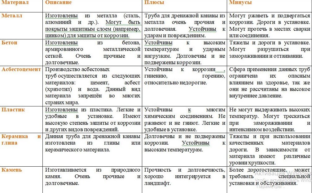 Конечный выбор материала трубы для дренажной канавы может зависеть от ряда факторов, таких как стоимость, прочность, долговечность и другие факторы. Более подробно рассмотрим каждый вариант. В таблице ниже приведены основные материалы для производства дренажных труб и их характеристики: