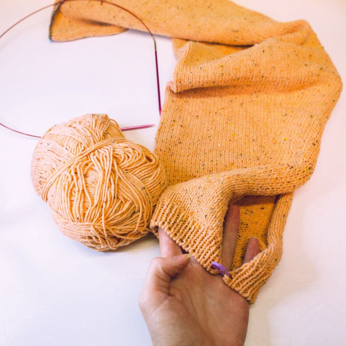 Из этой пряжи я изначально хотела сделать шапочку. Но потом стала тестировать образцы и поняла, что она текучая до невозможности. Решила скомбинировать её с остатками от носочного мериноса и сделать шейный весенний платок. Довязала до середины примерно и даже постирала, но первой ошибкой стало то, что я стала вязать не от центра, а от угла, и меня каждый раз беспокоила мысль, что если я вдруг начну вязать вторую симметричную половину платка раньше, чем нужно, у меня же останется пряжа! Была цель извязать весь моточек в ноль. Кораллово-лососевый оттенок очень красивый и в целом мне идёт, но оказалось, что я пока не знаю, с чем его сочетать. В гардеробе не оказалось ничего подходящего этому платку.
