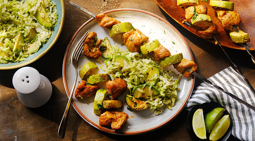 Обычно «жарить шашлык» – это целая история. Мало того что нужно правильно разжечь угли и замариновать мясо, хорошо бы его потом не сжечь и пережарить… Грудка индейки, выбранная в качестве основного продукта для шашлыка, очень облегчает жизнь, потому что быстро впитывает ароматы и вкусы маринада, да и готовится почти мгновенно. Кабачки – хороший «партнер» для индейки, потому что обладают точно такими же качествами. ИНГРЕДИЕНТЫ ПОШАГОВОЕ ПРИГОТОВЛЕНИЕ ⬇️ 👍 КСТАТИ Не пересушите, такой шашлык жарится очень быстро! Угли/нагрев гриля должны быть среднесильными, переворачивайте шашлык почаще и снимите с огня, когда мясо еще чуть мягкое при надавливании пальцем. кбжу А также ⬇️