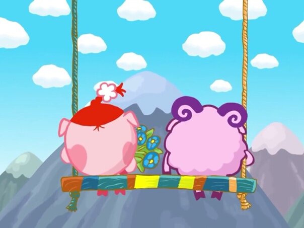 Я хочу разобрать 33-ю серию «горы и конфеты». Почему сразу 33-ю? Потому, что до этого серий со скрытым смыслом особо не было, поэтому вот так... Сюжет: Барашу, как поэту, нужно вдохновение, А для вдохновения нужно что-то великое, и это «великое» Бараш находит в горах. Сначала все шло хорошо: Бараш наслаждался горами, но позже горы стали выглядеть не такими «великими», и, чтобы это исправить, Бараш звал с собой на качели Нюшу, ведь с ней его повод для вдохновения превращался «из гор в ГОРЫ». Вскоре Нюше это стало надоедать: —Ты уже пятый раз притаскиваешь меня на эти качели, а потом два часа молчишь, как будто меня здесь нет! —Я смотрю на горы… —Замечательно! ты смотришь на горы, но я то тут причем? —Если честно, я и сам не могу понять: когда я смотрю на горы один, то горы как горы — ничего особенного, но если рядом посадить что-то вроде тебя, то горы превращаются в гоооры!.. —Хорошо! Ты смотришь на горы, тебе интересно, но я тоже должна делать что-то интересное, например, есть ко