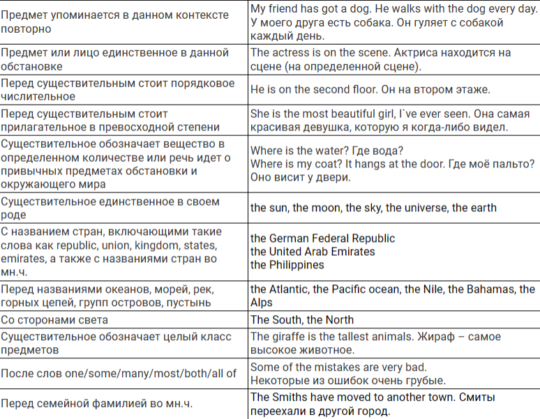 Определенный артикль the в английском языке употребляется с существительными как в единственном числе, так и во множественном; как с исчисляемыми, так и с неисчисляемыми существительными. Употребление определенного артикля the
