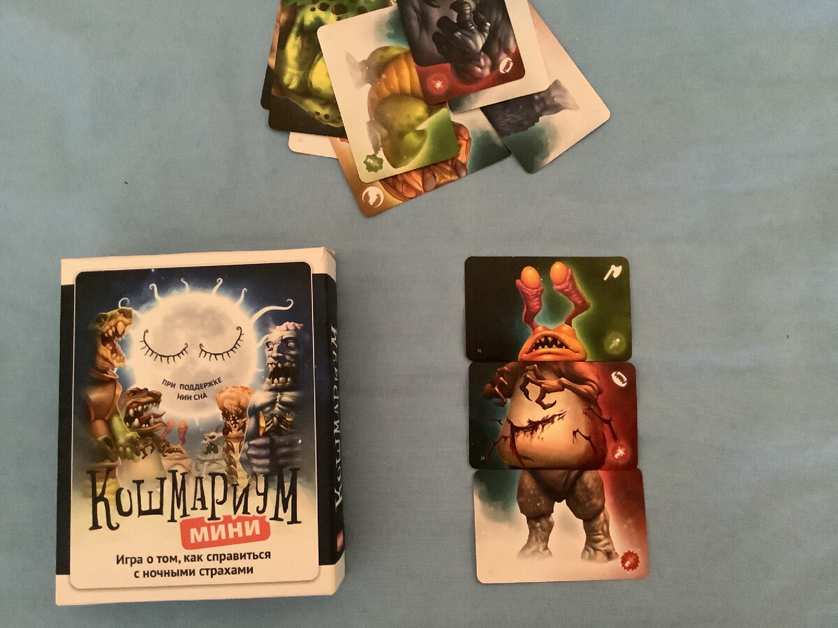 Во всей коробке только правила и колода карт с частями монстров (тело, голова, ноги) разных типов и с разными способностями. В свой ход мы можем сделать 2 действия из: а) Взять карты