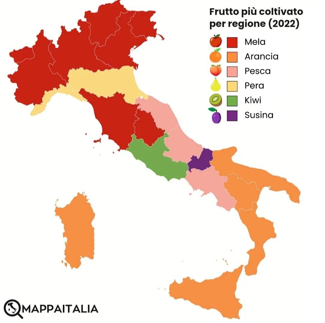 Италия и Испания - страны, где производится больше всего фруктов в Европе. Итальянец может просто пойти в свой сад и сорвать киви, лимон или апельсин себе на смузи к завтраку. Посмотрим, каких фруктов и где больше всего выращивается по регионам Италии 🍎 Mela - яблоко - лидер по выращиванию и сбору. В 2022 году было собрано 2.4 миллиона тонн яблок. Больше всего их растет в северной Италии, Тоскане и Умбрии. 🍊 Arancia - апельсин - на втором месте с урожаем 1.6 миллионов тонн. Апельсинов, как и остальных цитрусовых, много на юге и на островах (Сицилия, Сардиния). 🍑 Pesca - персик - 750 тысяч тонн персиков возделываются в центральной и южной частях (Кампания, Марке, Абруццо). Италия - главный поставщик персиков в Европе. 🥝 Kiwi - киви - 550 тысяч тонн, больше всего этого фрукта растет в Лацио. Италия - второй в мире производитель киви в мире. На первом месте Китай. 🍐 Pera - груша - Италия - лидер по грушам в Европе. В 2022 году было собрано 500 тысяч тонн груш. Лигурия и Эмилия-Роман