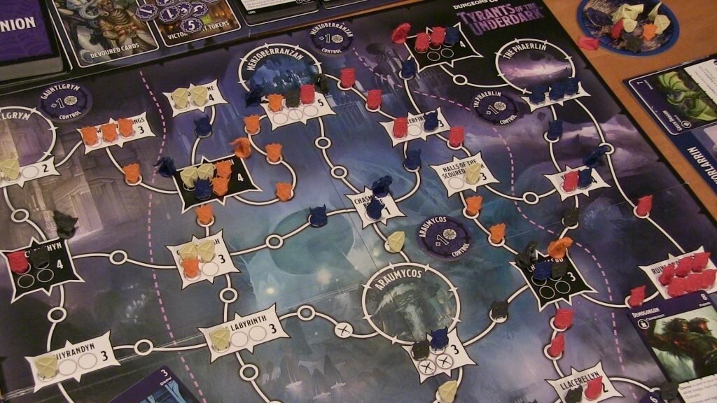 Тот самый, легендарный, первый своего имени (в смысле, из декбилдингов с полем). Игра, конечно, да…. оформлением- не удалась (рисунки местами невероятно кринжовые), локализацией тоже была обижена - то вырубка кривая, то разнотон, то наоборот, два цвета игроков легко попутать друг с другом, да еще картонные жетоны хрен ухватишь с поля… Но игра просто, как поется, “ракета-бомба-петарда”. В комплекте 6 колод - демоны, нежить, дроу, всякая подземная нечисть - и от того, как ты это замешаешь, зависит, какой выйдет партия. Имхо, пока не вижу смысла в фанатских допах, пока сам сыграл достаточно мало. Но уже надумал брать украшалки и, возможно, модульное поле.