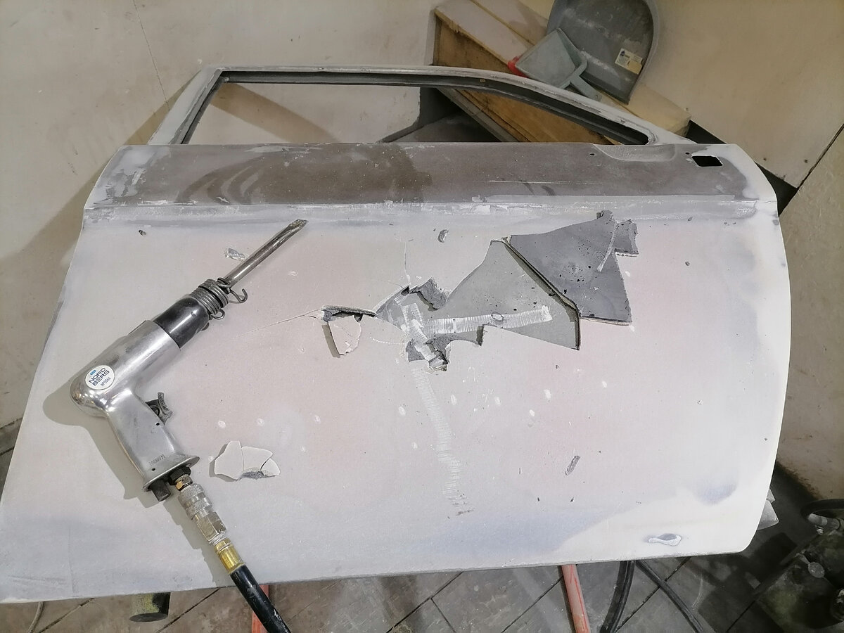 Кто по три раза все портит и переделывает, тот я. Самый многострадальный кузовной элемент на моей машине - задняя левая дверь. Вмятина посередине досталась еще из прошлой жизни. Я ее отрихтовал, как смог, но не в идеал. С этой двери я начал отрабатывать технологию ремонта с полной разборкой, менял ей низ (6 см полоску). И вроде бы все получилось, но когда начал выводить шпатлевкой - количество слоев все увеличивалось, а яма посередине все не исчезала. Ну не бросать же на полпути, столько материала уже переведено, и я себя уговаривал продолжать. Даже снял дверь, чтобы удобней с ней работать было. Однако разум когда-нибудь победил, я взял в руки пневмозубило и снес все к чертовой бабушке. Ну не буду я спокойно спать, когда на моей машине такая скульптура висит.