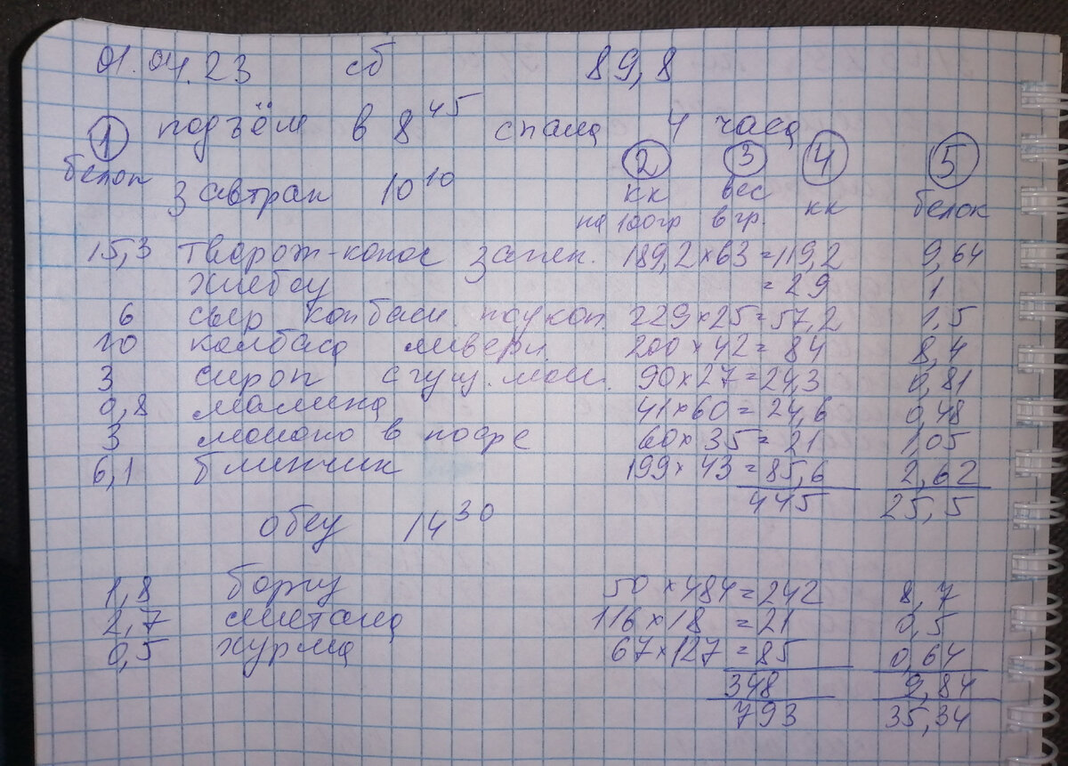 Далее время подъёма и примерное время сна. Далее приёмы пищи и их время. Для удобства все столбики цифр я пронумеровала, чтобы удобнее было объяснять. С некоторых пор я кроме калорийности за день решила ещё считать количество белка, как наиболее важного компонента, за жиры и угли я не переживаю, быстрых углеводов в моём рационе очень мало, а всего другого в норме.