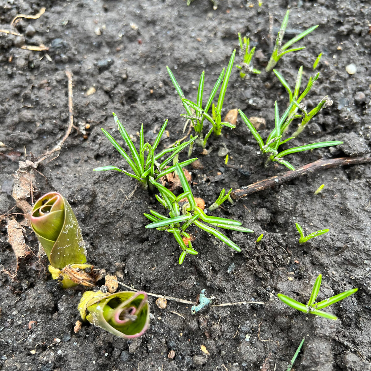 Доброго всем дня!☀️ Друзья-коллеги, уже открывшие садовый сезон, всё ли хорошо у вас, всё ли в саду радует или есть проблемы?.. Мой сад просыпается после зимней спячки, не успел сойти снег, а под ним уже живые растения. Это и весенние луковичные, и дицентра, и даже некоторые флоксы и торопыга-хоста. А также вечнозелёные садовые жители, которым нипочём снег и морозы. По ходу «инспекции» обнаружила, что успела пересадить осенью крокусы, о чём за зиму крепко забыла🤣 Посадила неглубоко, памятуя, что при прежней посадке они у меня так и не цвели. Но на этот раз, похоже, ну слишком неглубоко: часть луковичек оказалась вообще на поверхности: Там же проклюнулись мускари и рябчик шахматный. Рябчика пока немного, он более замедленный видимо: Нарциссы уже весело зеленеют: Тюльпаны всходят стройными рядами. В прошлый раз сажала куртинами, нынче решила не заморачиваться. Всё равно визуально цветы сомкнутся, когда подрастут: Вечнозелёное молодило, та самая Каменная роза, кое-где соседствует с осен