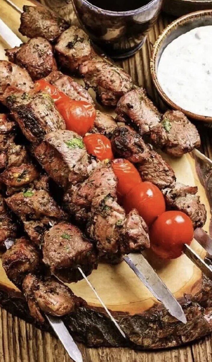 Шашлык-изначально блюдо стран Западной и Центральной Азии, а также Восточной Европы, из баранины мелкой нарезки, нанизанное на шампур и запечённое на древесном угле в мангале; при этом возможно применение маринада, от простейших специй (соль, чёрный перец, уксус) до сложных многокомпонентных составов, требующих особого приготовления. Позже название «шашлык» в русском языке распространилось на блюда из свинины, птицы, рыбы, овощей, грибов, приготовленные тем же способом.
