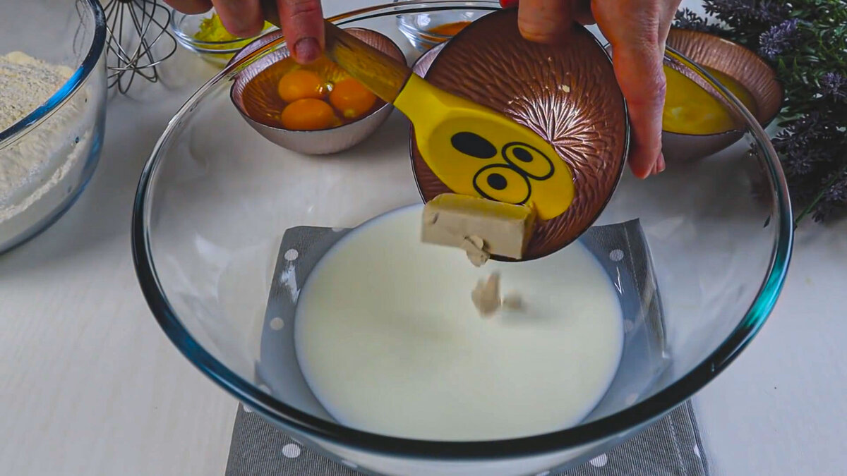 Всем привет! Меня зовут Елена и я рада Вас приветствовать на своём канале. Сегодня я хочу предложить приготовить пасхальный кулич. Простой рецепт очень вкусной, нежной, мягкой Пасхи. Готовим кулич: В миску вливаем тёплое молоко 240 г ( стакан), кладём дрожжи живые 25-30 г. Перемешиваем чтобы дрожжи растворились. Добавляем 3 яйца, сахар 260г., растопленное сливочное масло 100-120 г., цедру одного лимона, щепотку соли и для цвета куркуму 1 ст.л. Всё хорошо перемешиваем венчиком. Просеиваем муку 500-550г. и перемешиваем. Тесто получается немного жидким. Накрываем полотенцем и оставляем на 1.5-2ч. в тёплом месте. Просеиваем на рабочую поверхность немного муки, выкладываем тесто, наверх выкладываем мягкий изюм (предварительно замочить изюм в горячей воде на 10 минут). Смазываем руки растительным маслом и начинаем месить тесто. Делим тесто на части, заполняем формы примерно на треть. Накрываем полотенцем и оставляем в тёплом месте для подъёма. Выпекам примерно 30-40 минут при температуре 180