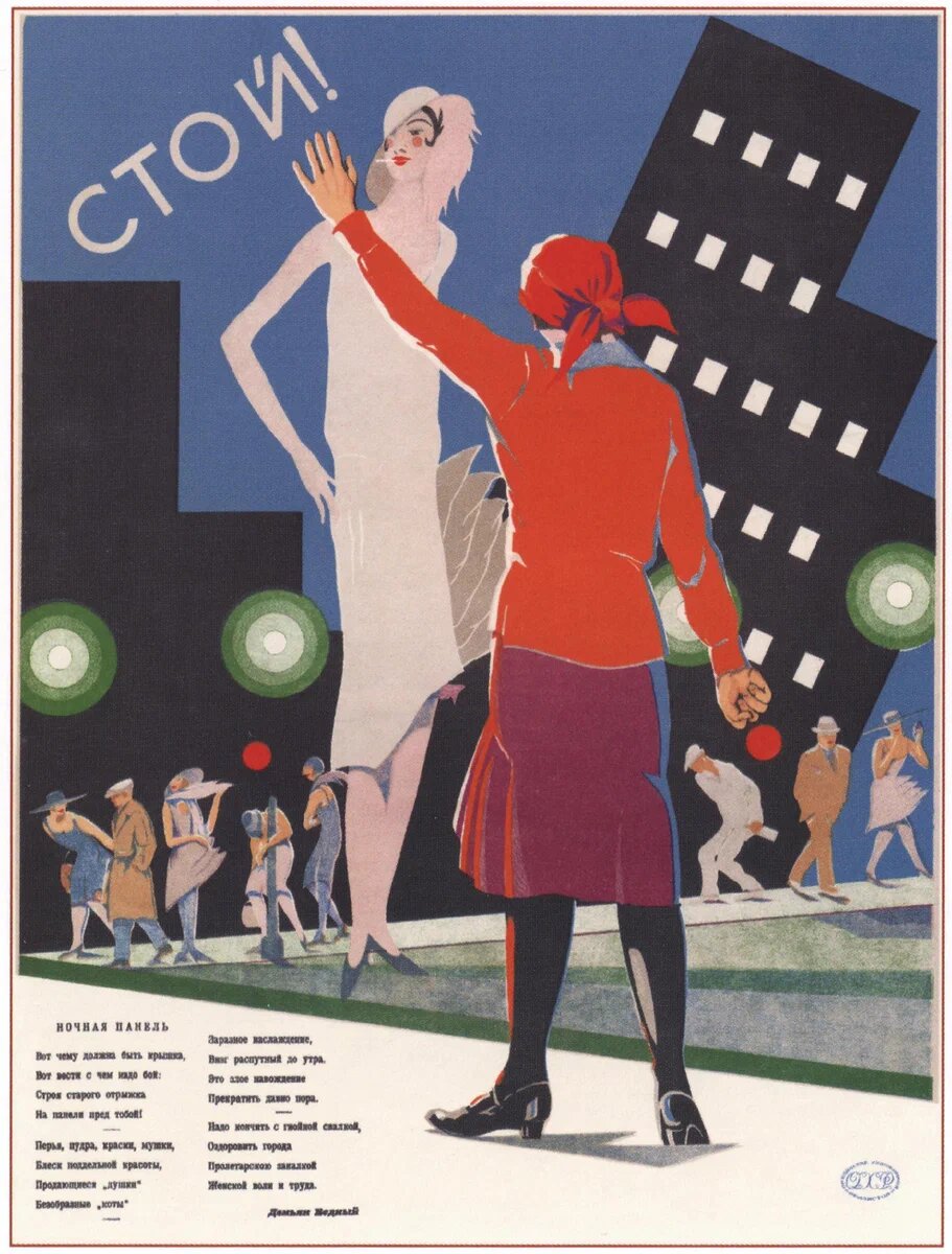 Этот смешной плакат конца 1920-х годов отражает эпоху НЭПа в СССР, когда большевики временно вернулись в буржуйские времена, разрешив бизнес и рыночную экономику. И среди этой экономики расцвели ночные бабочки, разлагая собой моральные устои красного общества.