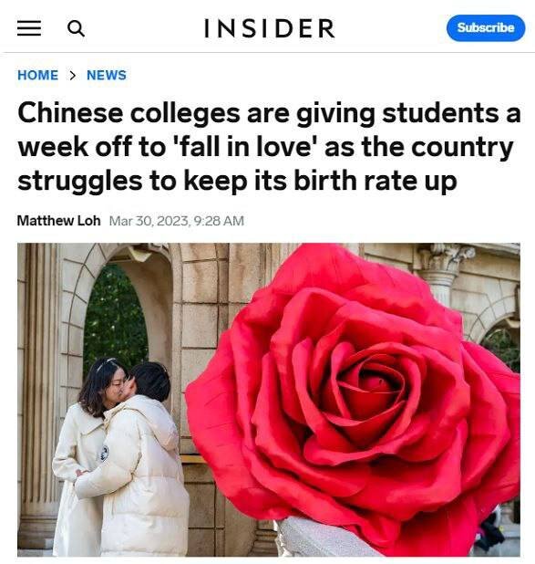 На фоне падения рождаемости в Китае 9 местных вузов решили предоставить своим студентам недельные каникулы (с 1 по 7 апреля). Молодым людям поставлена задача влюбиться. Поднять свои жопы, выползти из кампусов на свет божий и наконец найти себе пару.