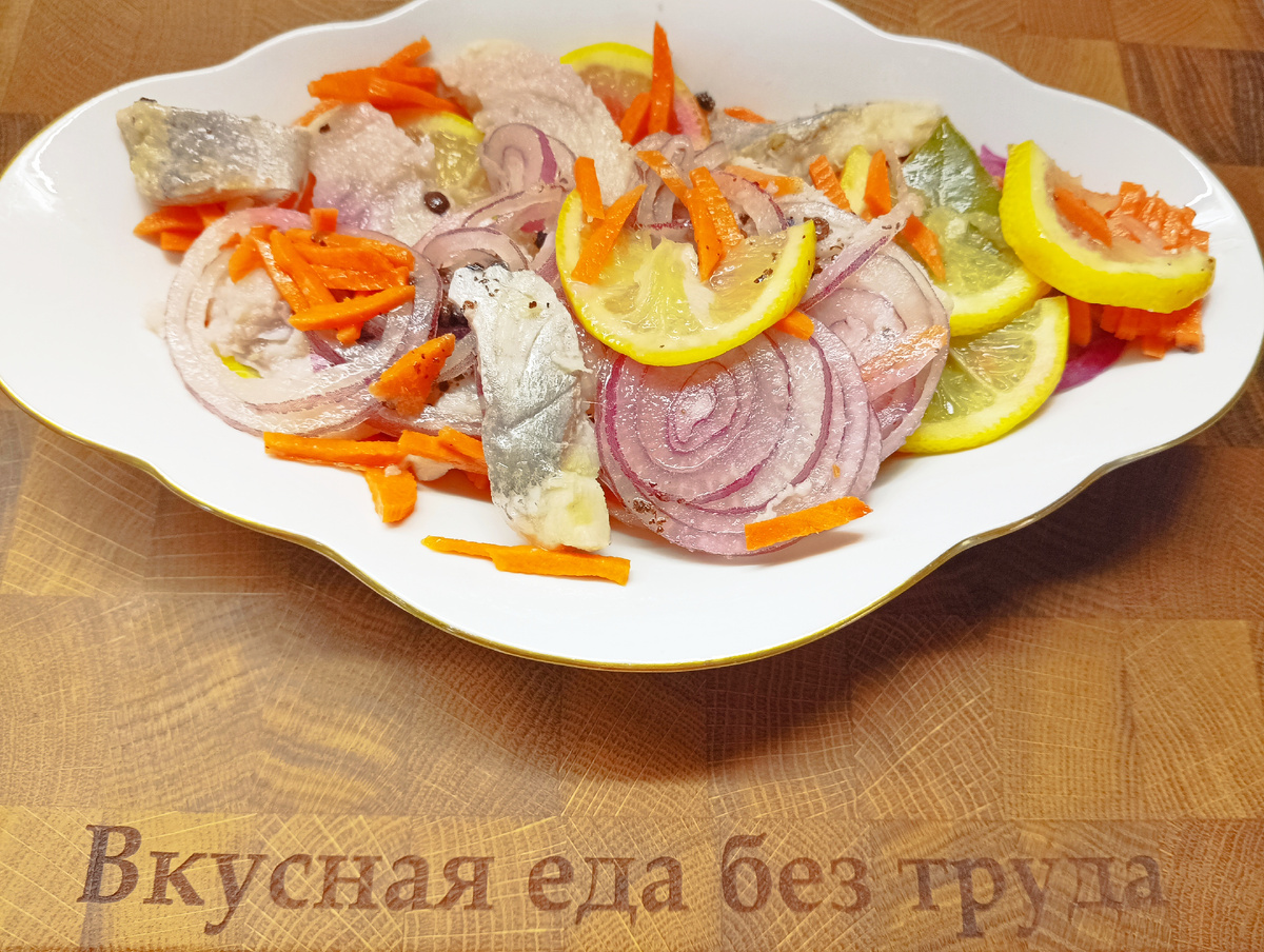 Эта очень яркая по виду и вкусу закуска готовится очень просто. Продукты для неё, пожалуй, есть у всех в доме, где готовят еду. Лимон только нужен обязательно. Сельдь лучше брать целую и разделывать на филе самой. Если в рыбе окажется икра или молоки, то они тоже пойдут в дело. В ленивом варианте можно взять готовое филе сельди, что я и сделала. Ингредиенты: филе 1-ой крупной солёной сельди 1 луковица (лучше синяя или белая) 1 морковь 1/2 лимона 5 лавровых листов 15-18 горошин чёрного перца 3 ч. л. сахара растительное масло по вкусу и желанию Филе сельди нарезаю кусочками шириной 1-2 см. Морковь нарезаю только ножом, тонкой соломкой. Лук нарезаю кольцами. Так обозначено в родном рецепте. Горошины чёрного перца измельчаю в ступке на не очень мелкие фрагменты. Можно перемолоть их в мельнице. Лимон тщательно мою. Половину крупного лимона нарезаю тонкими половинками, удаляя косточки. Это количество ингредиентов идеально помещается в полулитровую банку. На дно банки помещаю лавровый лист, л