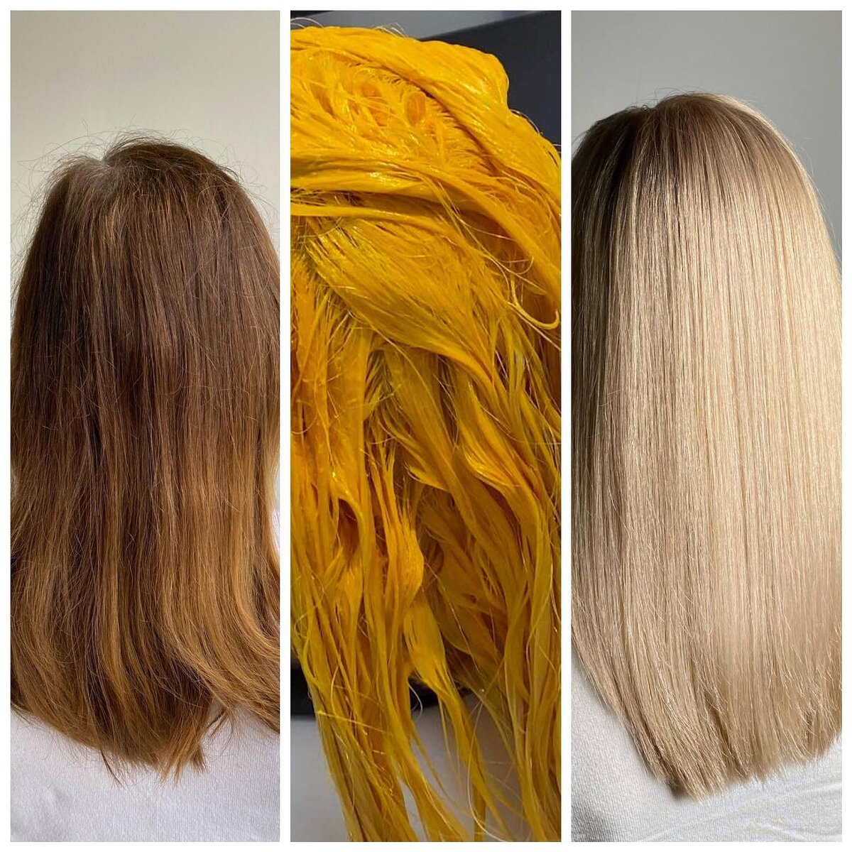 Бежевый блонд с очень легким притемнением корней. Банальная работа, правда? Но не все так просто. База: Алгоритм работы: Ошибка, совершенная на отработке – переосветлили корни при декапировании. Обожаю случайные ошибки за их ценность! Ведь благодаря им: Вернемся к нашей модели. После декапирования получились очень светлые (что вполне логично, ведь натуральные волосы осветляются быстрее, чем окрашенные) корни и пронзительно-желтая длина. Что делать в этой ситуации? Репигментировать переосветленные участки. Делается это для того, чтобы выровнять фон осветления. Как проводили репигментацию? Микстон Gold с большим количеством окислителя на 5-7 минут. Этого достаточно.⠀ Чем еще можно выполнить репигментацию?: Неопытный колорист испытает шок когда увидит, что волосы при репигментации приобретают желтый цвет, даже практически оранжевый. Но знания, расчет и опыт нас не подведут. Тонирование: - корни 6.23 + 7.12 + 8.3 + 8.4 - длина 8.21 + 10.12 + 8.3 + 8.4 Окислитель 1.8% тонируем на влажные во