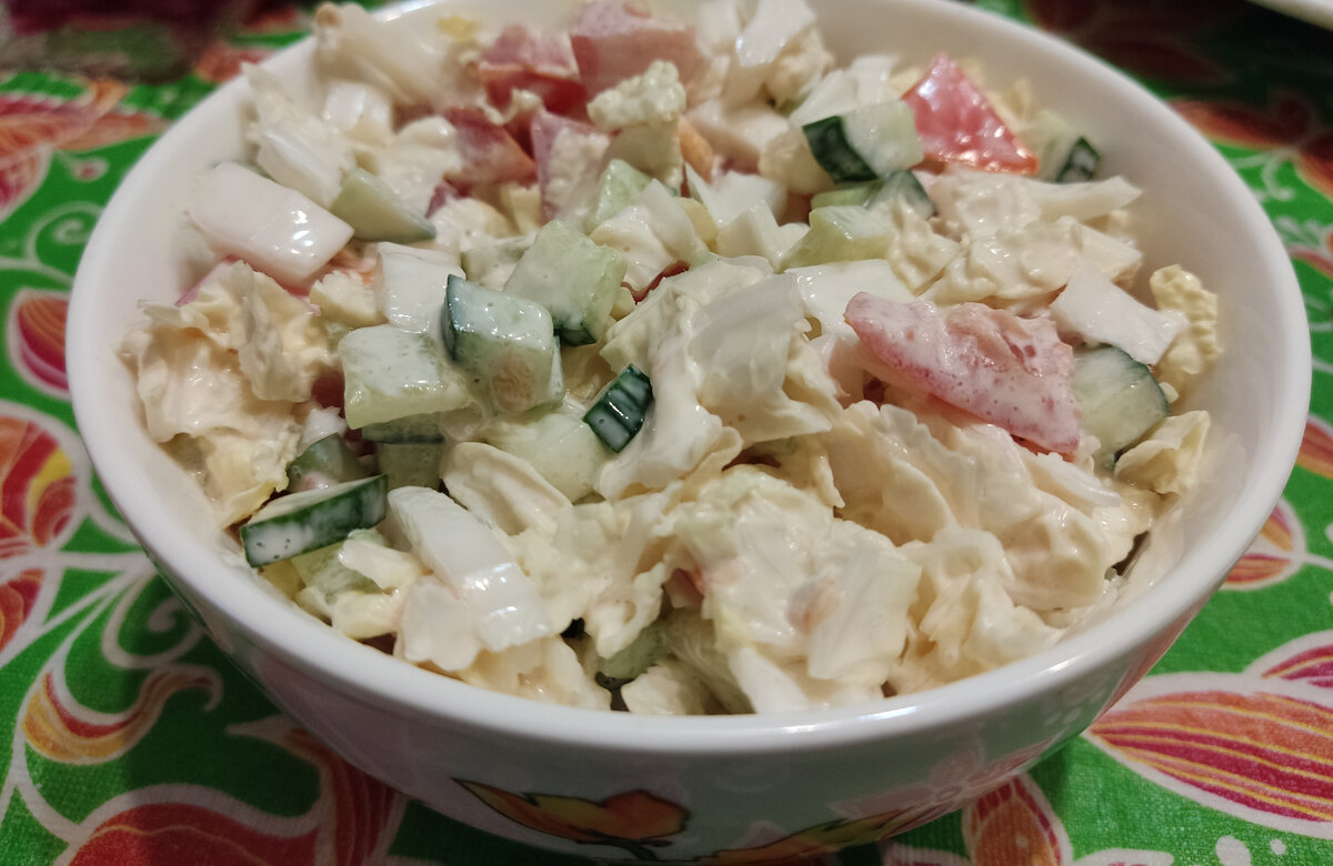 Приветствую вас на канале! Подписывайтесь и смотрите больше рецептов. Для приготовления такого салата необходимо порезать пекинскую капусту (1/4 вилка). Один огурец и помидору порезать и добавить к капусте. Всё смешать, посолить и добавить майонез, смешанный с выдавленным чесноком. В самый низ чашки положить обжаренную куриную грудку, а сверху выложить овощи. Салат постоянный гость на нашем столе из-за своей простоты в приготовлении. К тому-же он очень вкусный. Ингридиенты: Приятного аппетита!!!