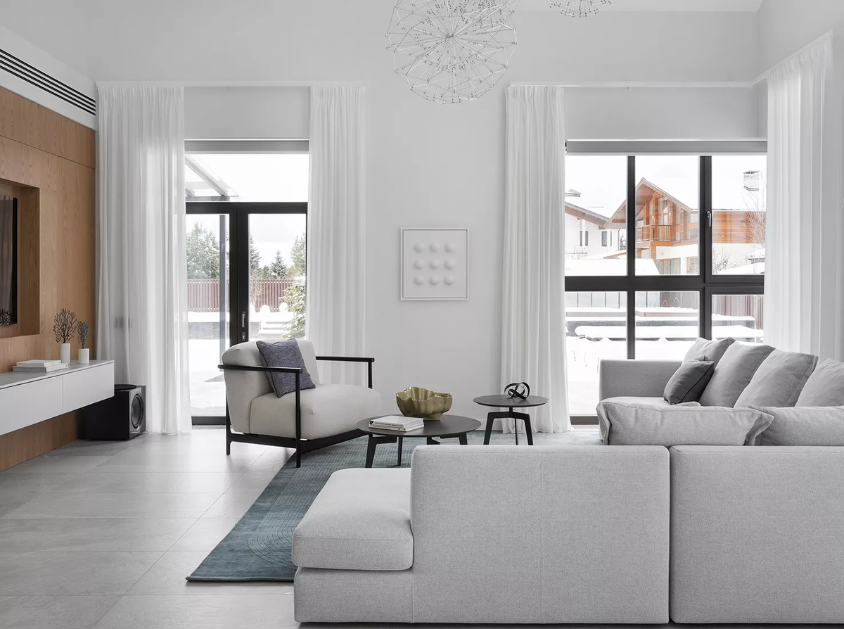«Заказчик изначально хотел получить светлый и сдержанный интерьер. Белые стены были одним из его главных пожеланий. Интерьер построен на сочетании белого, светло-серого, черного цветов и теплых оттенков дерева. Есть небольшие цветные акценты в виде ковров и картин, но эти цвета сдержанные, как и весь интерьер. Выделяется только комната подростка, в которой использован глубокий синий цвет в виде акцента».