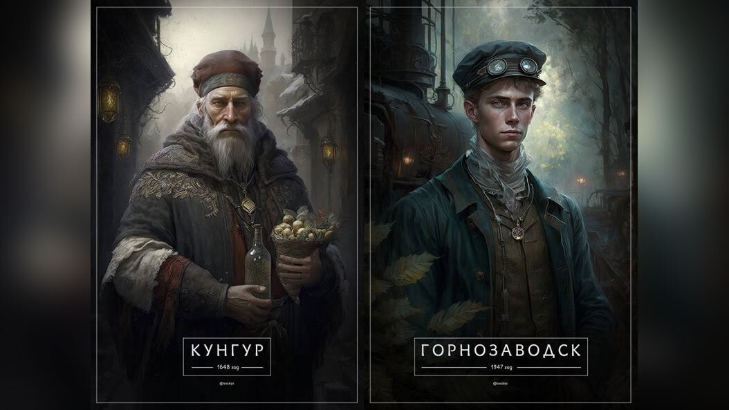 Нейросеть изобразила два города пермского края в человеческих образах. Картины были созданы программой Midjourney на основе текстовых описаний пользователя Кир Sol. Кунгур предстал старцем с седой бородой в купеческой одежде, а Горнозаводск в образе юноши, напоминающим машиниста поезда.