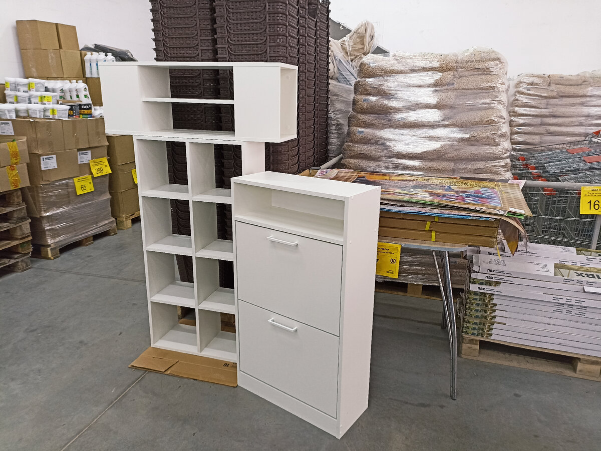 Аккуратная обувница из 2-х дверей и полки размером 58/25/102 см. Цена 1825 рублей.