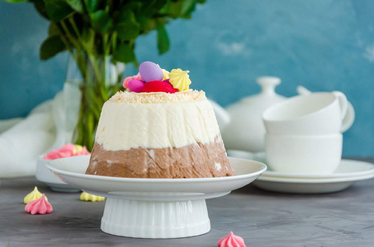 Полосатая пасха без сырых яиц представляет собой традиционное блюдо к пасхальному столу, которое подается в необычной форме. Благодаря тому, что в составе лакомства нет яиц, она не требует выпекания. Поэтому процесс ее приготовления доступен даже неопытным хозяйкам. Готовится полосатая пасха будет из 2 основ разного цвета: светлой и коричневой. В последнюю будем добавлять темный шоколад. Выкладывать массу в пасочницу будем слоями. Причем совсем необязательно, чтобы они были ровными. Гораздо интереснее блюдо будет смотреться на столе, если слои немного перемешать непосредственно в пасочнице. Стоит отметить, что творожная пасха считается довольно полезным продуктом. Ведь она содержит полноценные молочные жиры и белки, которые легко усваиваются организмом. Творог благотворно влияет на состояние сердца и сосудов, снижает уровень стресса и холестерина в крови. Вместе с тем его рекомендуется включать в рацион во время анемий. При желании в светлый слой можно добавить сухофрукты или свежие яг