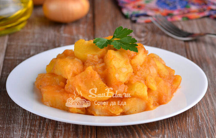 Такую картошку можно подавать в качестве основного постного блюда или в качестве гарнира. Готовится блюдо очень просто, за счет добавления одной специи получается очень красивое. Тушеную картошку можно готовить на воде, овощном или мясном бульоне. Картошка красивая с отличным вкусом. Порции 3 Время подготовки 20 минут Время приготовления 40 минут Ингредиенты Инструкции 1. На растительном масле обжариваем мелко нарезанный лук. 2. Картофель очищаем, нарезаем на средние ломтики и добавляем в лук. Картофель после нарезки не промываем. Крахмал, который остается на картофеле, при тушении сделает жидкость более густой. 3. Вливаем овощной бульон, чтобы он покрыл картофель. Овощной бульон можно заменить на воду. Если готовим непостное блюдо, то добавляем любой мясной бульон. 4. Солим, если бульон несоленый. Добавляем сладкую паприку и молотый перец. Паприка дает красивый цвет. 5. Все перемешиваем, накрываем крышкой и готовим около 40 минут. Время приготовления зависит от сорта картофеля. 6. Ка