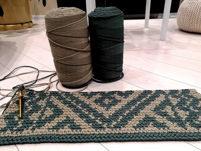 Решили, что в рабочую зону кухни (в районе мойки) необходимо покрытие, которое будет устойчиво к истиранию, не подвержено воздействию влаги, служить защитой иногда падающим предметам столового инвентаря и непритязательно в уходе. Поэтому выбор вместо х/б пал на 5 мм полиэфирный шнур. Работа выполнена крючком №6. Размер коврика 120*60 см. Вот так он выглядит на боевом посту. По расходу: шнур зеленого цвета - 400м, шнур цвета речного жемчуга - 320м. Вес: 2, 1 кг. Тыльная сторона коврика обработана жидким латексом, чтобы не скользил. Спасибо за внимание. Пост автора BrPartisan. Комментарии к посту на сайте Пикабу.