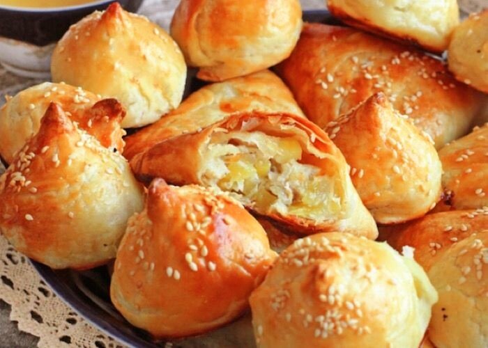 Ингредиенты Для тесто 500гр муки 240мл воды 1 ч. л соли 150гр слививочного масла Для смазывания яйца Для посыпки кунжут Начинки 500гр куриное мясо 2 шт картофель 2 шт лук По вкусу соли, Зира,кориандр 50гр растительное масло Смазать тесто 200гр сливочное масло Приготовить: 1 шаг В первую очередь принимаемся за приглашение теста. Для этого смешиваем муку, воду и соль. Оборачиваем подготовленное тесто пищевой плёнкой и оставляем на 15 минут. 2 шаг После чего принимаемся за приготовление начинки. Для этого очень мелко нарезаем куриное мясо, очищенный картофель и лук. По вкусу соль, Зира, кориандр. Также добавляем специи и вливаем растительное масло. Хорошо все перемешиваем. Очень важно нарезать ингредиенты очень мелко. 3 шаг По истечении нужного времени делим тесто на 2-3 части и каждый из них очень тонко раскатываем. Смазываем сливочным маслом. При этом растапливать его не надо. 4 шаг После чего сворачиваем каждую часть в рулет, немного растягивая. Затем формируем улитку и накр