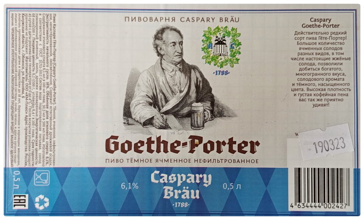 Так как я заслуженный портеровед России, не смог пройти мимо такой локальной вещи. Каспаре это местный ресторан-пивоварня. Нареканий к их пиву нет, все хорошо, здорово, но все с оглядкой на то, что пиво будет под еду. А значит должно быть легко, питко и пр. С Портером такое не думаю, что пройдёт, но будем посмотреть. Цвет, пена, все шикарно. Аромат. Классический, густой, но глубокий и не интенсивный. В нем по не многу креозота, угля, пепельницы. Очень хотелось бы уловить кожу, но нет, ее нет. Аромат отличный, ни каких косяков, все согласно стилю. Вкус. Его бедным не назвать... Однако! Очень плотное солодовое тело, причем оно переваливается у тебя на языке аж до финала. Карбонизация деликатная, небольшая. И с середины до финала масло, пепельница, горечь угля. Но не сильная, горечь тут лишь нюанс. Она тут просто потому что должна быть. Сам финал пустоват, водянист. Хотя по мне, в минусы это отнести никак невозможно. Послевкусие продолжительное, в нем как раз хорошо различима горелая дере